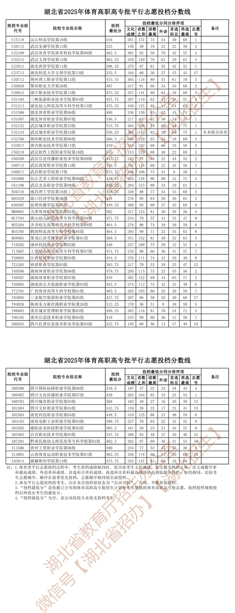 湖北省2025年體育高職高專批平行志愿投檔分數線