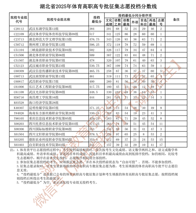 湖北省2025年體育高職高專批征集志愿投檔分數線
