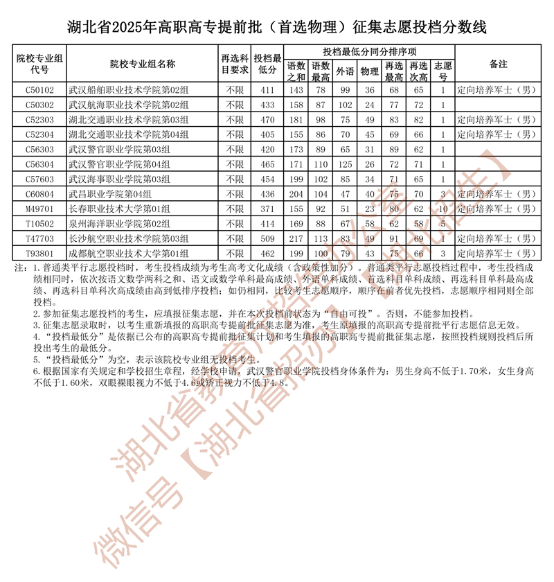湖北省2025年高職高專提前批(首選物理)征集志愿投檔分?jǐn)?shù)線