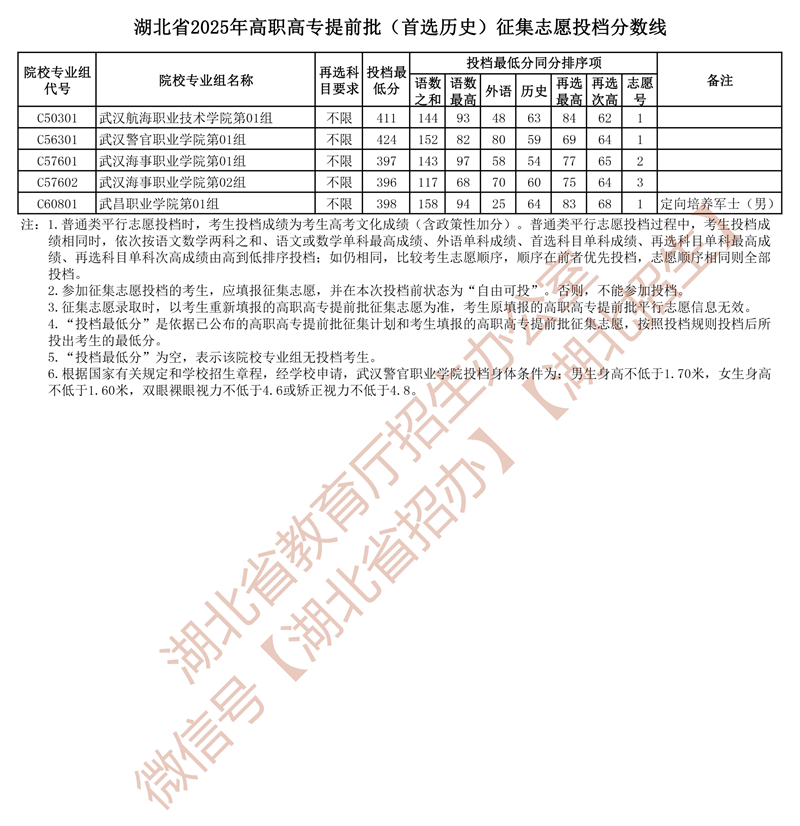 湖北省2025年高職高專提前批(首選歷史)征集志愿投檔分數線