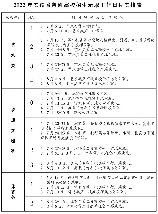 2023年安徽省普通高校招生錄取工作日程安排表