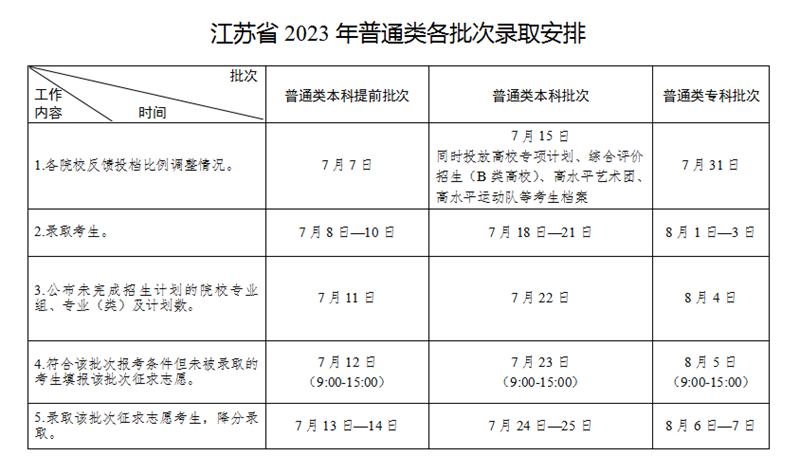 2023年江蘇省普通高校招生錄取批次和時間安排如下。