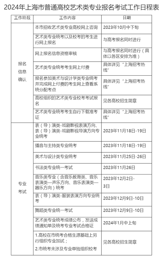 2024年上海市普通高校藝術類專業報名考試工作日程表