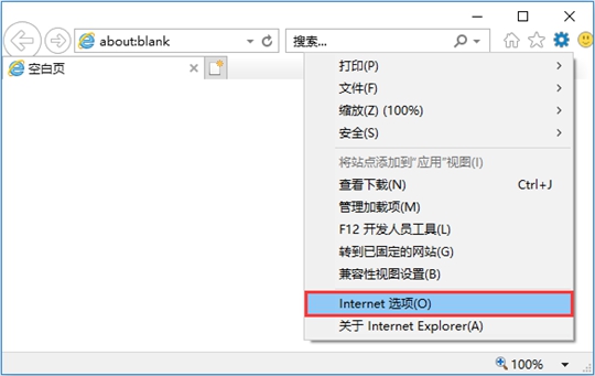 打開IE瀏覽器,點擊“設置”-“Internet(選項)”,如下圖: