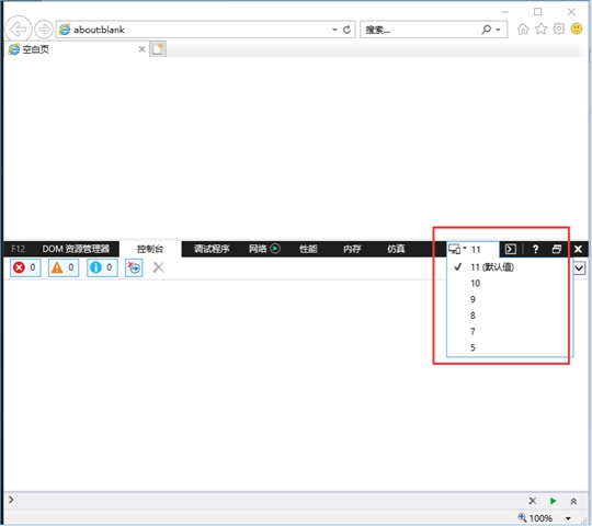 打開IE瀏覽器,點擊“F12”鍵,會出現瀏覽器模式設置,要求此處設置的版本必須與瀏覽器實際版本一致。