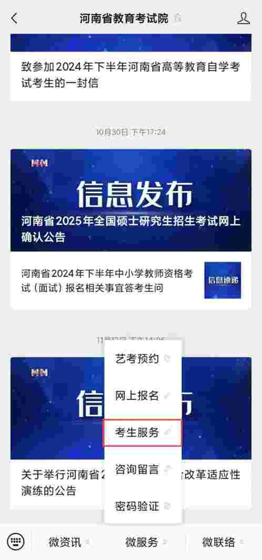 進入“河南省教育考試院”微信公眾號,點擊下方菜單欄,選擇【微服務】->【考生服務】綁定考生信息。