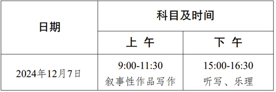 表(導)演類中戲劇影視導演的敘事性作品寫作科目考試時長為150分鐘;音樂類2個筆試科目同堂不合卷,考試順序依次為聽寫和樂理,考試總時長為90分鐘,其中聽寫科目答題方式為五線譜記譜,樂理科目答題方式為填涂機讀卡。