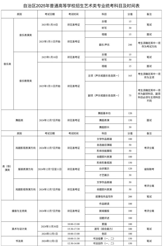 2025年我區藝術類專業統考共包含音樂類、舞蹈類、表(導)演類(戲劇影視表演和戲劇影視導演方向)、播音與主持類、美術與設計類、書法類6大類別,考試時間從2024年11月30日陸續開始,其中美術與設計類、書法類專業統考考點分別設置在烏魯木齊市、喀什市、奎屯市,考點具體名稱及地址見準考證。舞蹈類、表(導)演類(戲劇影視表演和戲劇影視導演方向)、播音與主持類專業統考考點在新疆藝術學院金橋校區(考點示意圖見文末)。音樂類專業統考考點在新疆師范大學昆侖校區(考點示意圖見文末)。每個科類統考前5日起,考生可登錄自治區教育考試院官方網站(www.xjzk.gov.cn)打印準考證。