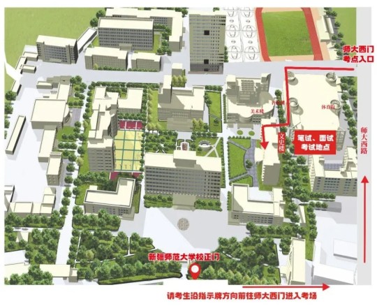 ▲新疆師范大學(昆侖校區)考點示意圖請音樂類考生從新疆師范大學西門進入