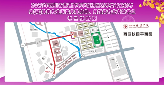 考生可乘710路公交車到達考點,也可導航到四川傳媒學院西區南1號門(成都市郫都區花石路116號)。考生統一從四川傳媒學院西區南1號門進出;考生家長和車輛不得進入校園。