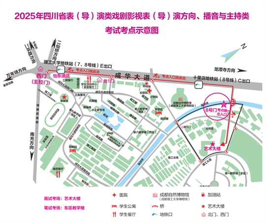 戲劇影視表(導)演方向、播音與主持類專業統考考點設在成都理工大學藝術大樓(成都市成華區二仙橋東三路1號);乘坐地鐵的考生從成都地鐵8號線十里店站C口出站,乘坐其他交通工具的考生在成都自然博物館(成都理工大學博物館)下車,然后按指示牌的引導進入考點;考點限考生本人憑準考證和身份證進入,考生家長、帶隊老師和送考車輛一律不得進入校園。