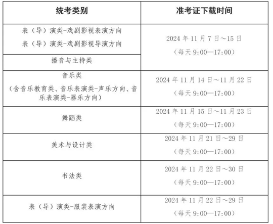 2025年上海市普通高校招生藝術類專業統一考試將于2024年11月16日--12月1日進行。根據各類別的統考時間,考生本人須提前一周自行網上下載打印相應專業統考準考證。符合上海市高考報名資格、已在網上報名參加本市藝術類專業統考并完成網上付費的考生,務必在以下規定的時間段內自行登錄“上海招考熱線”網站(www.shmeea.edu.cn),點擊頁面下方的“考試報名”欄目進入,下載打印準考證并妥善保管。各統考類別下載時間安排如下: