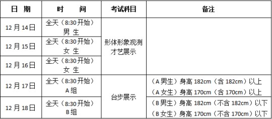 1、形體形象觀測(cè)、才藝展示:男生2024年12月14日考試,女生2024年12月15-16日考試。上午8:30考試,下午13:00考試,上午單元未考完,下午單元考試順延。檢錄時(shí)間為上午8:00-8:45,下午12:30-13:15,未按規(guī)定時(shí)間候考(或檢錄)的,視為放棄考試。【形體形象觀測(cè)(四樓402室),才藝展示(一樓101表演廳)】。