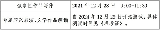 敘事性作品寫作科目:考生持本人《準考證》《不攜帶手機進入考點承諾書》、身份證原件等材料,按規定時間和地點參加考試。開考前45分鐘考生開始入場,開考15分鐘后遲到考生不得進入考點參加當次科目考試。考試結束后方可交卷出場。