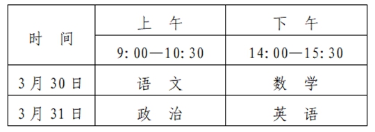 文化考試由省教育考試院按全國統一時間組織進行,文化考試科目為語文、數學、政治、英語四科,每科滿分150分,四科滿分600分,使用國家通用語言文字作答。我省考點及具體安排另行通知,考生須于2024年3月23日12:00后登錄“體育單招系統” 打印文化考試準考證。考試時間如下: