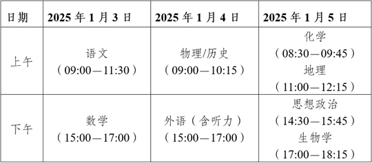 各位考生:為幫助廣大考生熟悉新高考考試模式,我省定于2025年1月3——5日進行2025年普通高校招生考試適應性測試(以下簡稱適應性測試),現就有關事項提示如下: