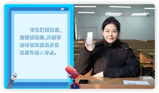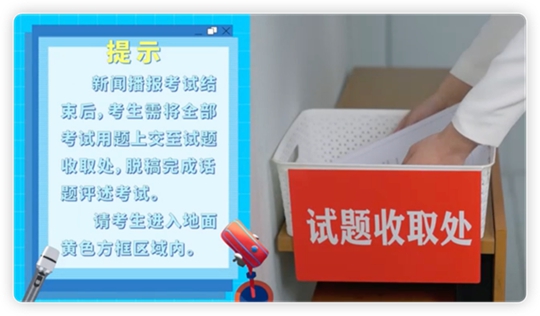 (2)考場工作人員播放新聞播報科目的考試指令。當考生聽到“新聞播報開始考試”提示音后,考生立刻開始作答,考試計時屏開始計時提醒,考生應注意把握考試時間。