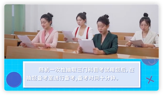 5、考生進入候考室,重新隨機分組,并由引導員將考生帶入抽題備考室。考生通過考試系統隨機一次性抽取三門科目考試用題,在抽題備考室進行備考,備考時間10分鐘。