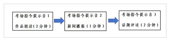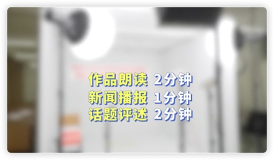 7、考生在同一考場一次性完成作品朗讀、新聞播報、話題評述的所有考試科目,考試時長分別為作品朗讀2分鐘、新聞播報1分鐘、話題評述2分鐘,總時長為5分鐘。