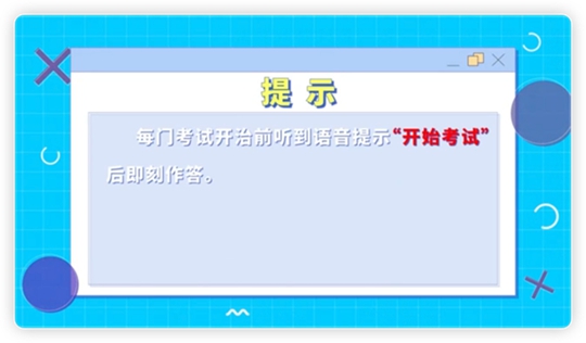 1.每科目考試前,考試系統都會發出考試指令提示音。當考生聽到“某某科目開始考試”提示音后,考生須立刻開始作答。