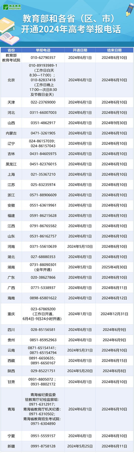 教育部和各省(區、市)開通2024年高考舉報電話 |