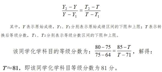 例如,某同學化學科目原始成績為75分,按照原始成績排序,等級比例應劃分到B等級,而該科目B等級的原始成績分布區間為80——64,等級分數區間為85——71,按照轉換公式: