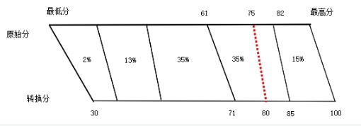 第一步,將該科目考生卷面原始分從高到低依次按照15%、35%、35%、13%和2%的比例劃分為A、B、C、D、E共5個等級,考生的原始分轉換成等級。缺考、零分考生人數不計入轉換基數,違規或作弊考生計入轉換基數,但轉換后的成績按零分計。