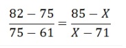 第二步,根據分數轉換參數設置,將B等級內該考生的原始分,依照等比例轉換方法,轉換到71-85區間,即T1、T2分別為71和85,依據轉換公式,該考生思想政治科目等級轉換分為: