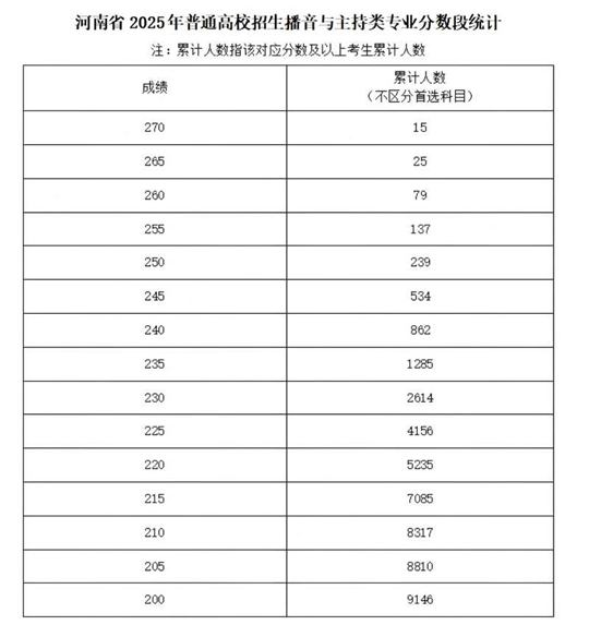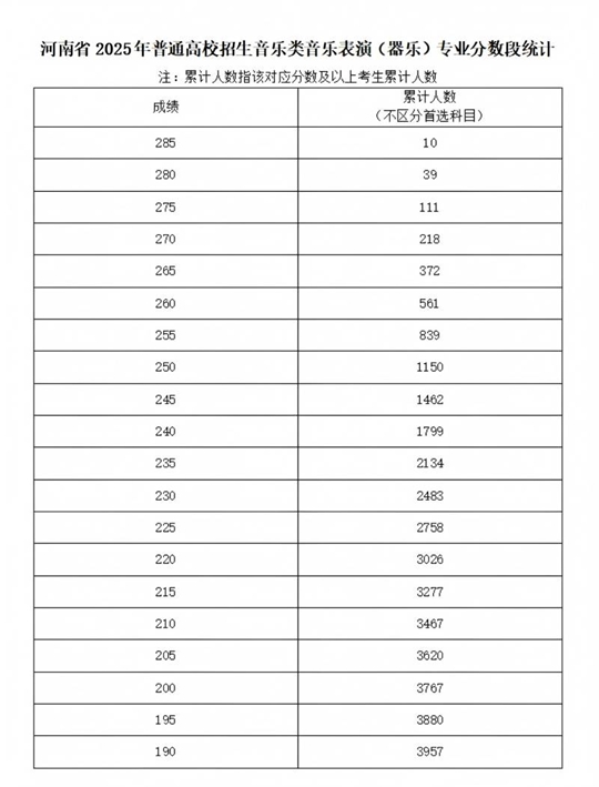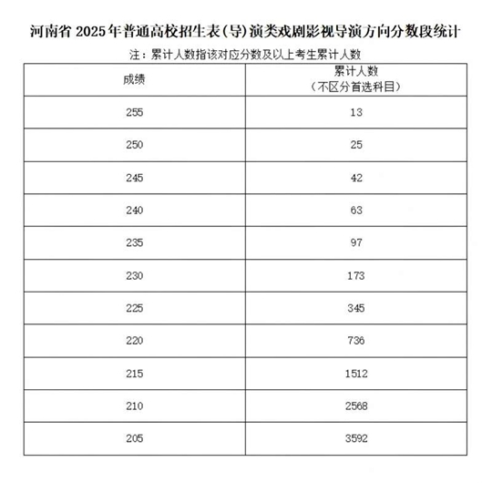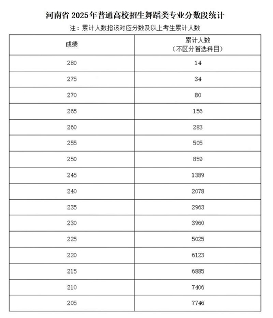 河南省2025年普通高校招生藝術類專業省級統考舞蹈類、播音與主持類、音樂類和表(導)演類戲劇影視表演及戲劇影視導演方向分數段統計