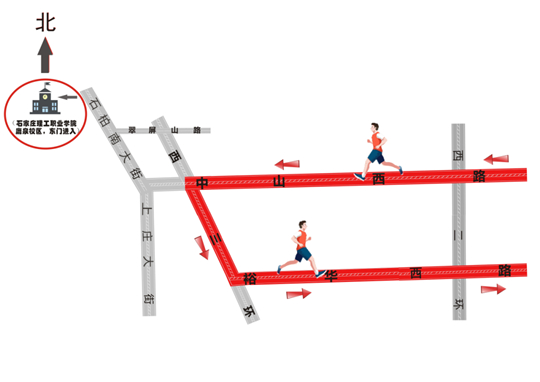 (二)3月30日上午(7:30開始),石家莊市將舉辦馬拉松賽事,途徑路段實行臨時交通管制(即禁即停、即放即行),請考生盡量避開管制路段,提早趕往考點,或提前安排在考點附近住宿(住宿地點應避開馬拉松賽區)。石家莊市馬拉松賽路線圖如下:
