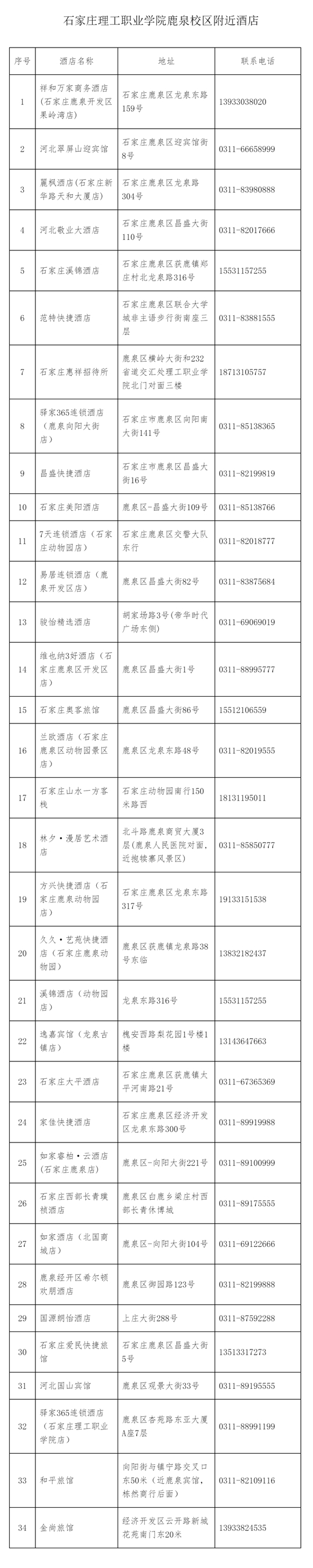 石家莊理工職業學院鹿泉校區附近賓館如下(僅供考生參考,住宿地點請避開馬拉松賽區):