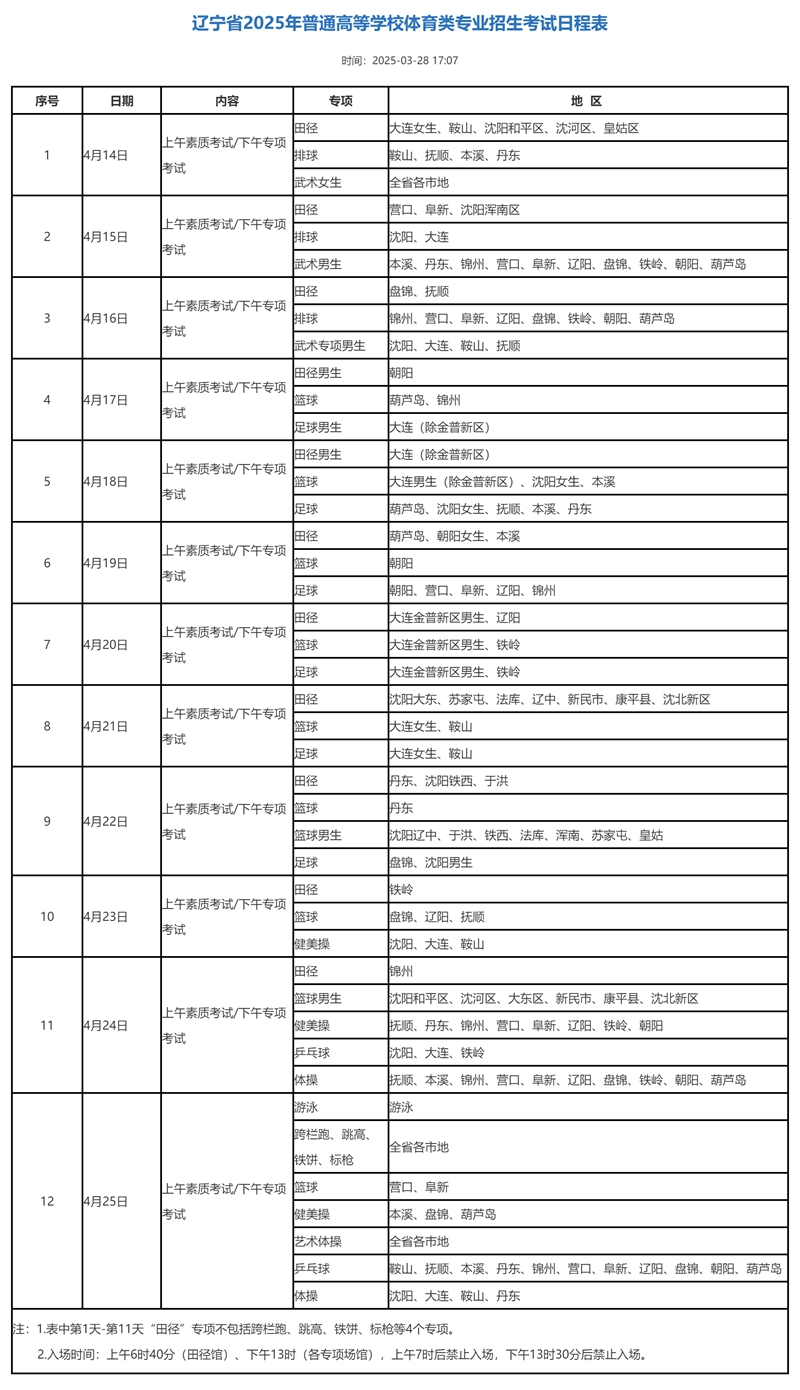 遼寧省2025年普通高等學校體育類專業招生考試日程表
