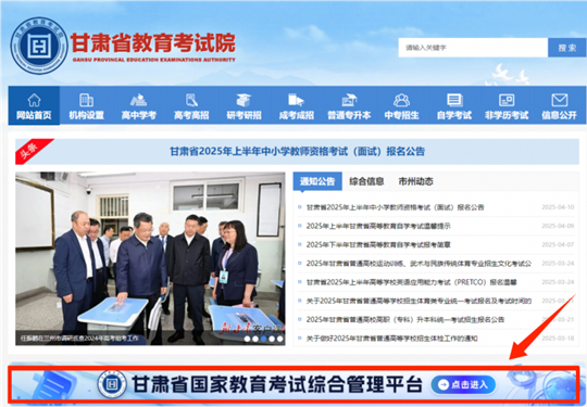 第一步:通過電腦端進入甘肅省教育考試院官網(網址:https://www.ganseea.cn),進入官網后,點擊進入下方【甘肅省國家教育考試綜合管理平臺】模塊(圖1)。