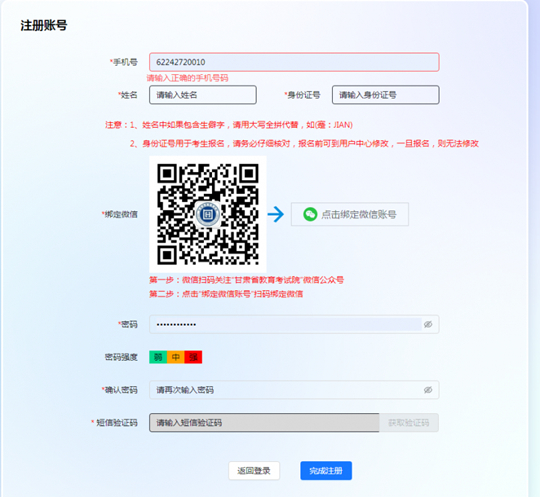 此處考生注冊必須要填寫手機號、姓名、和身份證號碼,并綁定微信。設置登錄密碼(請至少使用大小寫字母、數字、符號三種類型組合的密碼,長度至少為8位,且不包含空格),最后進行短信驗證。(圖6)