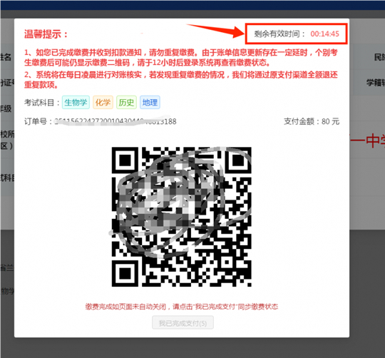 如未繳費,或繳費不成功,當前頁面需等“剩余有效時間”結束(或刷新頁面)才能關閉。