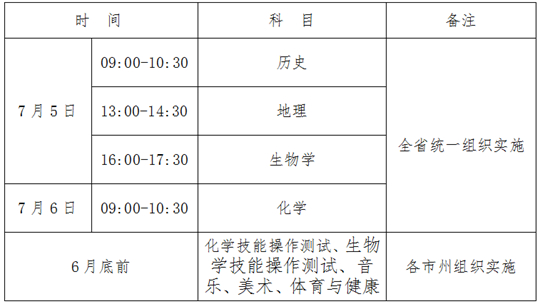 各市州負責化學技能操作測試、生物學技能操作測試、音樂、美術和體育與健康科目的報名和考試工作。