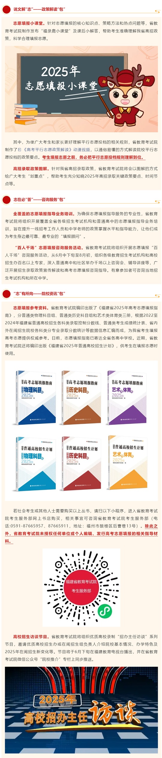 為助力廣大考生圓夢理想學府,福建省教育考試院推出志愿填報服務“大禮包”,從政策解讀到填報技巧,從數據查詢到注意事項,多渠道、多方式為大家提供志愿填報指導服務,敬請考生和家長密切關注!