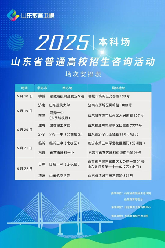 權威解讀招生政策,面對面解答報考疑問。為幫助廣大考生及家長全面了解2025年高校招生政策,科學填報高考志愿,2025年山東省普通高校招生咨詢活動(本科場)將于6月18日至22日在全省多地舉行。
