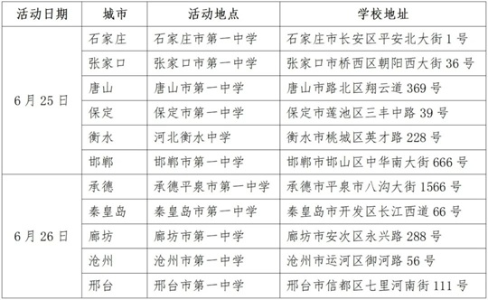 2025年6月25日、26日上午9:00-12:00,下午13:30-17:00(石家莊、張家口、唐山、保定、衡水、邯鄲于25日組織,承德、秦皇島、廊坊、滄州、邢臺于26日組織)。各市具體安排如下: