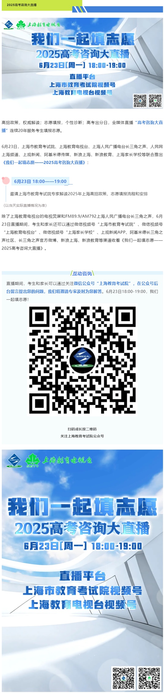 上海:6月23日,“我們一起填志愿”2025年高考咨詢大直播來(lái)了