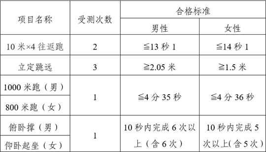 以上4個項目須全部進行測試,男生1000米跑、女生800米跑為必須合格的項目,另外3項需合格兩項。達到前述條件的考生體能測試結(jié)論為合格。