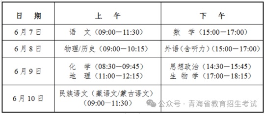 全省普通高考于6月7日—10日統(tǒng)一進(jìn)行。各科目考試時(shí)間(北京時(shí)間)安排如下: