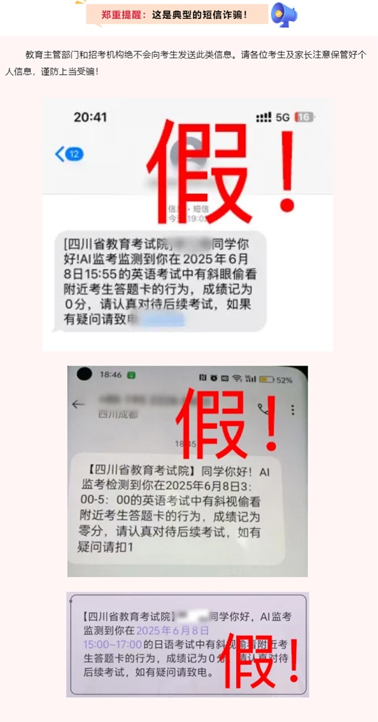 近日,部分高考考生收到所謂“四川省教育考試院”的短信,稱在考試中被AI監(jiān)考發(fā)現(xiàn)其有作弊行為,成績記為0分。