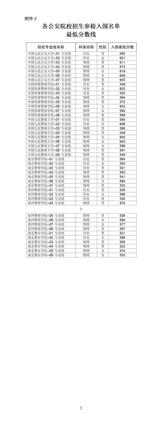 2.各公安院校招生參檢入圍名單最低分數線