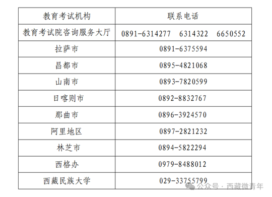 6.現場咨詢:西藏自治區教育考試院咨詢服務大廳,各地市教育局考試中心、西格辦招生辦、西藏民族大學招生辦。