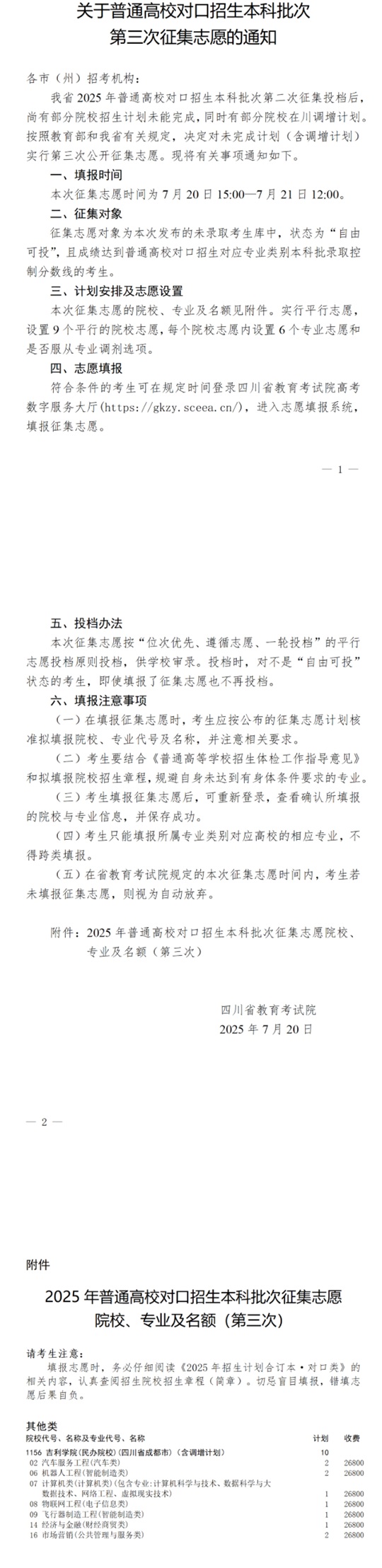 四川:關于普通高校對口招生本科批次第三次征集志愿的通知