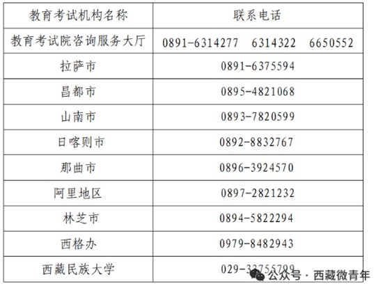 西藏自治區(qū)教育考試院咨詢服務(wù)大廳,各地市教育局考試中心、西格辦招生辦、西藏民族大學(xué)招生辦。