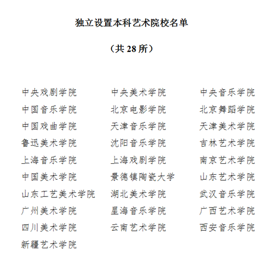 清華大學、中國傳媒大學、中央民族大學、東華大學、江南大學、北京服裝學院、北京印刷學院(限視覺傳達設計專業、數字媒體藝術、動畫、繪畫等4個專業)、天津工業大學、上海大學、哈爾濱音樂學院、上海視覺藝術學院、蘇州大學(限視覺傳達設計、環境設計、產品設計、服裝與服飾設計等4個專業)、浙江傳媒學院(限播音與主持藝術、廣播電視編導、攝影、錄音藝術、影視攝影與制作等5個專業)、浙江理工大學(限藝術設計本科專業)、內蒙古大學(限音樂表演、表演、音樂學3個本科專業)、武漢設計工程學院成龍影視傳媒學院(限表演、播音與主持藝術、戲劇影視美術設計等3個本科專業)、浙江音樂學院(僅限音樂學、音樂表演、作曲與作曲技術理論、舞蹈表演、舞蹈學、舞蹈編導、表演、藝術與科技等8個本科專業)及河北美術學院(限書法學、雕塑、藝術與科技、動畫、數字媒體藝術、廣播電視編導、服裝與服飾設計、戲劇影視美術設計、影視攝影與制作、表演、播音與主持藝術等11個專業)。