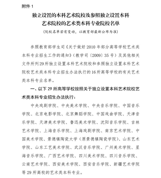 1.獨(dú)立設(shè)置的本科藝術(shù)院校及參照獨(dú)立設(shè)置本科藝術(shù)院校的藝術(shù)類本科專業(yè)院校名單