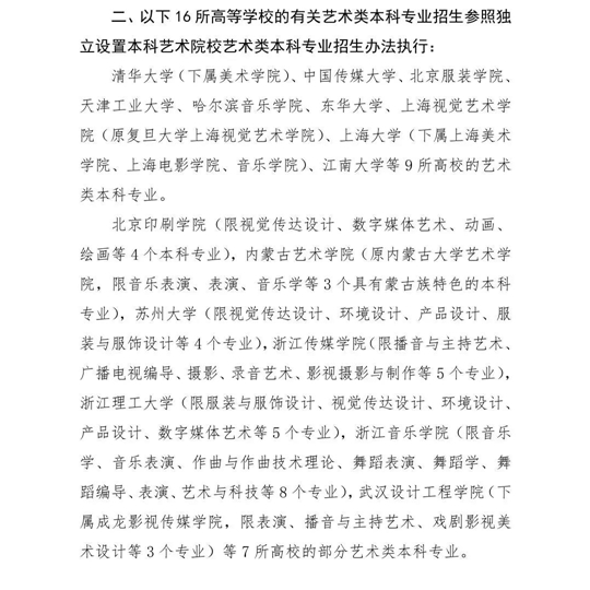 T段安排學(xué)校為:使用校考成績的獨(dú)立設(shè)置藝術(shù)高校、經(jīng)教育部批準(zhǔn)參照獨(dú)立設(shè)置藝術(shù)高校管理的普通高校(以下簡稱“獨(dú)立設(shè)置本科藝術(shù)類院校”,詳見附件1)和使用校考成績的教育部直屬普通高校的藝術(shù)類本科專業(yè),以及使用統(tǒng)考成績,但是不使用我省投檔規(guī)則的上述高校;使用我省音樂學(xué)(器樂)統(tǒng)考成績按照樂器種類招生且有明確的樂器種類招生計(jì)劃數(shù)的二本及以上高校本科專業(yè)等。